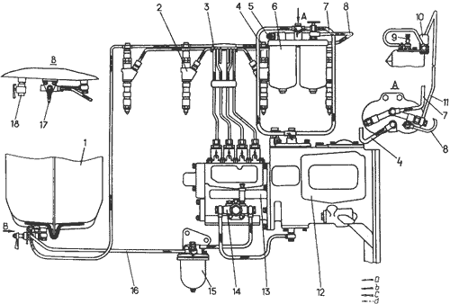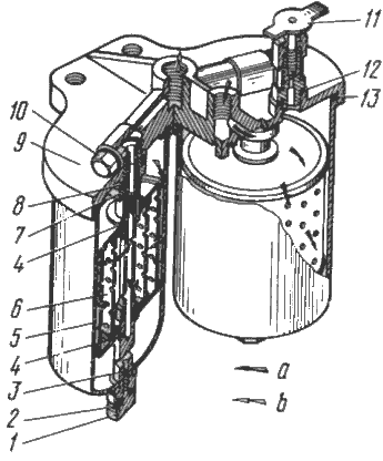 Для удаления осадка из стаканов 5 (см. рис. 12) фильтра закрыть проходной кран 17 (см. рис. 8) топливного бака, вывернуть пробки 1 (см. рис. 12), ввернутые в центральные стяжные стержни 3 и отвернуть продувочный вентиль 11, находящийся на сливной трубке. Отстой сливать до появления чистого топлива.