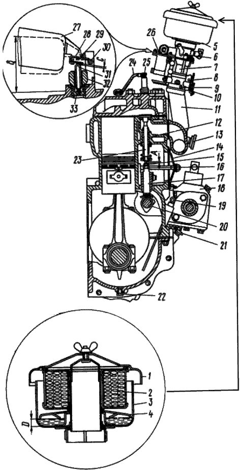 • снять воздухоочиститель 5 с двигателя. При снятии воздухоочистителя не наклонять его во избежание вытекания масла;