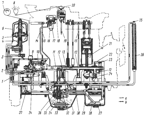 1-плита маслораспределительная; 2-канал подвода масла в главную масляную магистраль; 3-клапан двойного действия; 4-канал подвода очищенного масла из центрифуги; 5-штуцер; 6-кольцо; 7-седло клапана; 8-кольцо; 9-шарик; 10-пружина; 11-трубопровод подвода масла от маслозакачивающего насоса к маслораспределительной плите; 12-маслозакачивающий насос (МЗН); 13-трубка забора масла из картера; 14-крышка люка; 15-картер; а-при работе МЗН; b-при работе дизеля.