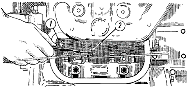 Винтом-ограничителем 2, расположенным на рычажке оси дроссельной заслонки, установите небольшое открытие дроссельной заслонки. После этого запустите вновь двигатель. Вывинчивая винт-ограничитель и одновременно придерживая тягу регулятора, доведите частоту вращения коленчатого вала до минимально устойчивой без перебоев в работе двигателя. При регулировании винт-ограничитель 2 воздействует на дроссельную заслонку, а винт 1 холостого хода регулирует качество горючей смеси. Дальнейшее уменьшение частоты вращения коленчатого вала, при необходимости, произведите поворачиванием винта 1 холостого хода.