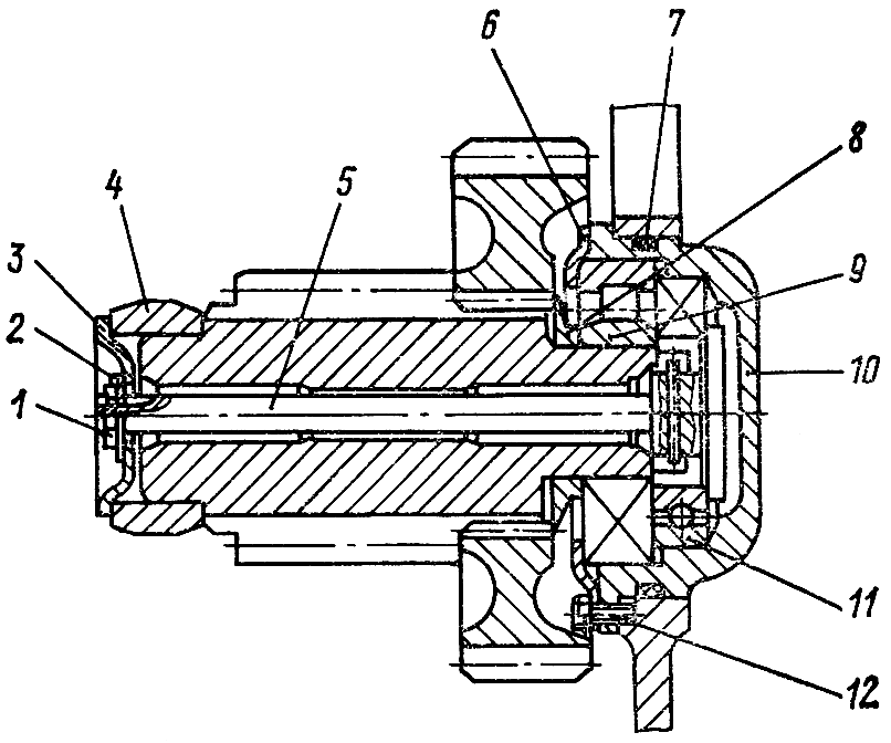 Наденьте на корпус 10 резиновое кольцо 7. Вставьте в корпус стержень 5 и запрессуйте шарикоподшипник 11 до упора в бурт корпуса. Запрессуйте наружное кольцо роликоподшипника 9 до упора в шарикоподшипник. Установите собранный корпус подшипника в гнездо корпуса бортовых фрикционов до упора во фланец. Закрепите фиксатор 6 к корпусу бортовых фрикционов четырьмя болтами 12 со. стопорными шайбами.