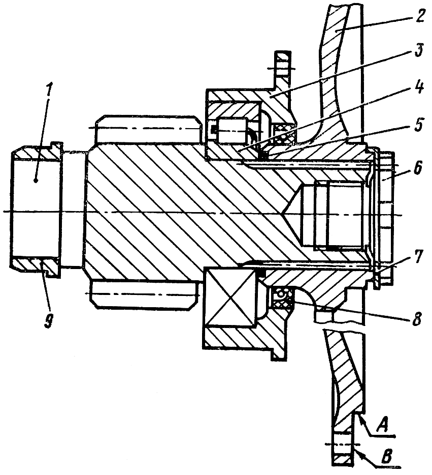 Запрессуйте в корпус подшипника наружное кольцо роликоподшипника 4 до упора в.бурт корпуса. Нагрейте внутренние кольца роликоподшипников 4 и 9 в масляной ванне до 363 К (90°С) и напрессуйте на шейки вала-шестерни 1 до упора в бурт. Разукомплектовка колец подшипников не допускается. Наружные и внутренние кольца одноименных подшипников должны иметь одинаковую маркировку. Наденьте на шлицевой конец вала шестерни резиновое кольцо 5, корпус 3 подшипника с наружным кольцом роликоподшипника — на внутреннее кольцо. Напрессуйте на шлицы ведущей шестерни фланец 2 до упора во внутреннее кольцо роликоподшипника. Установите собранный узел центра и проверьте биение поверхностей А и В. Биение поверхности А допускается не более 0,6 мм, а поверхности В не более 0,2 мм. Установите стопорную шайбу 7 на торце ведущего фланца и вверните пробку 6 в отверстие вала шестерни специальным ключом до упора. Момент затяжки 40...60 Н-м (4...6 кгс-м). Отогните край стопорной шайбы на фланец, а усики на пазы пробки. Установите прокладки В ( см. рис. 256 ), обеспечив осевой люфт фланца ведущей шестерни в пределах 0,4...1,5 мм, для чего: