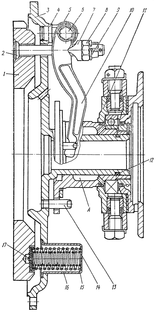 Установите в канавку фланца уплотнительное кольцо 12. Заполните смазкой Литол-24 полость А ползуна муфты и наденьте на фланец муфту включения 11 с рычагом. Палец 13 фланца должен войти в отверстие ползуна. Установите в паз опоры4 ролик 5 и, надев на регулировочный болт рычаг 10, закрепите рычаг на опоре пальцем с гайкой. Зашплинтуйте гайку. Аналогично установите остальные рычаги. Установите на регулировочные болты 2 призмы 7 и наверните гайки 8, зашплинтовав шплинтами 9.
