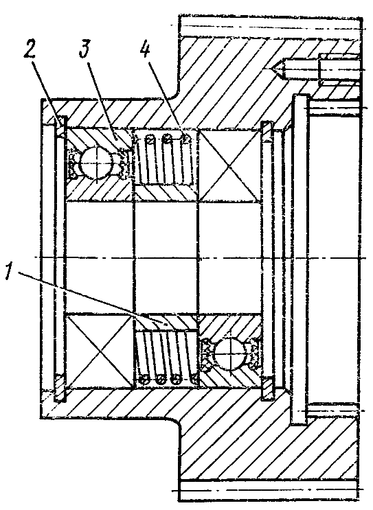 Выньте из внутренних канавок зубчатого барабана стопорные пружинные кольца 2 ( рис. 194 ). Выпрессуйте два шарикоподшипника 3 вместе с распорной втулкой 1 и пружиной 4.