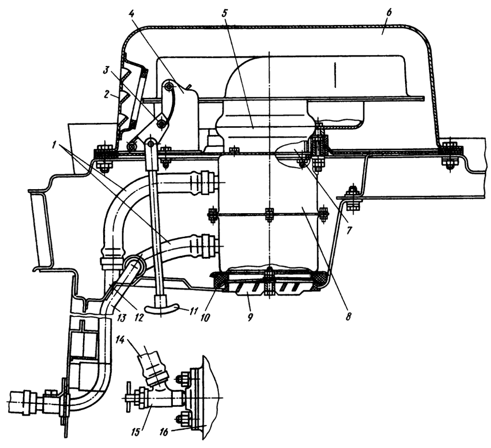 В заливную горловину бака вставлен сетчатый фильтр с сеткой и топливомерная линейка. Фильтр удерживается в горловине бака пружинным кольцом. Сверху горловина бака закрывается крышкой 2. Через отверстие в крышке внутренняя полость бака сообщается с атмосферой. Чтобы через это отверстие внутрь бака не попадала пыль, в крышке имеется набивка.