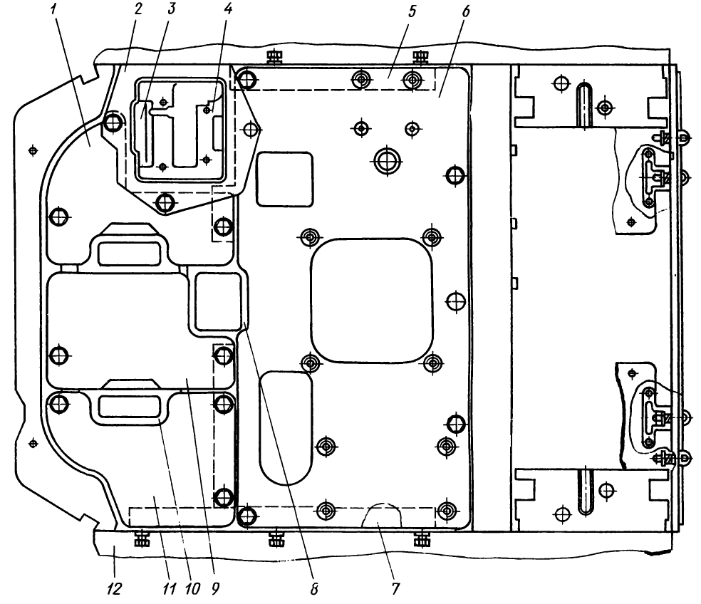 Кабина установлена на крылья, заднюю и переднюю балки через резиновые прокладки 9.